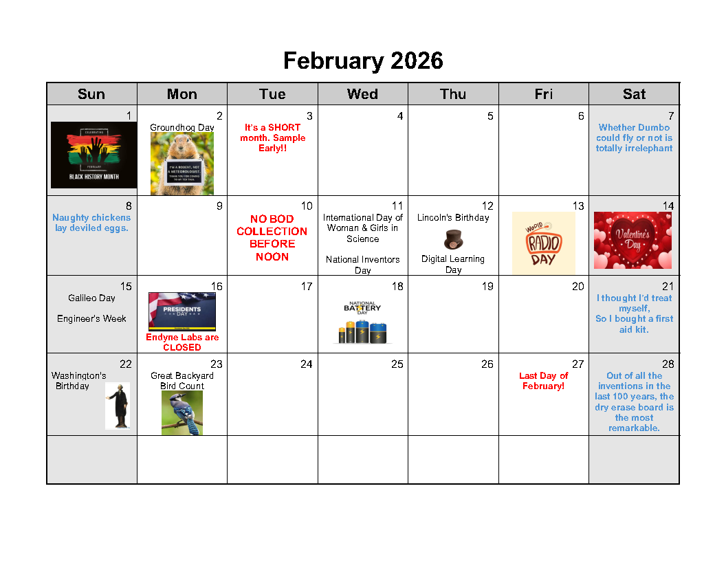 All three Endyne locations will be closed Monday, February 16th in observance of President’s Day. Please consider the following lab specific scheduling changes when planning your sampling for the week prior.